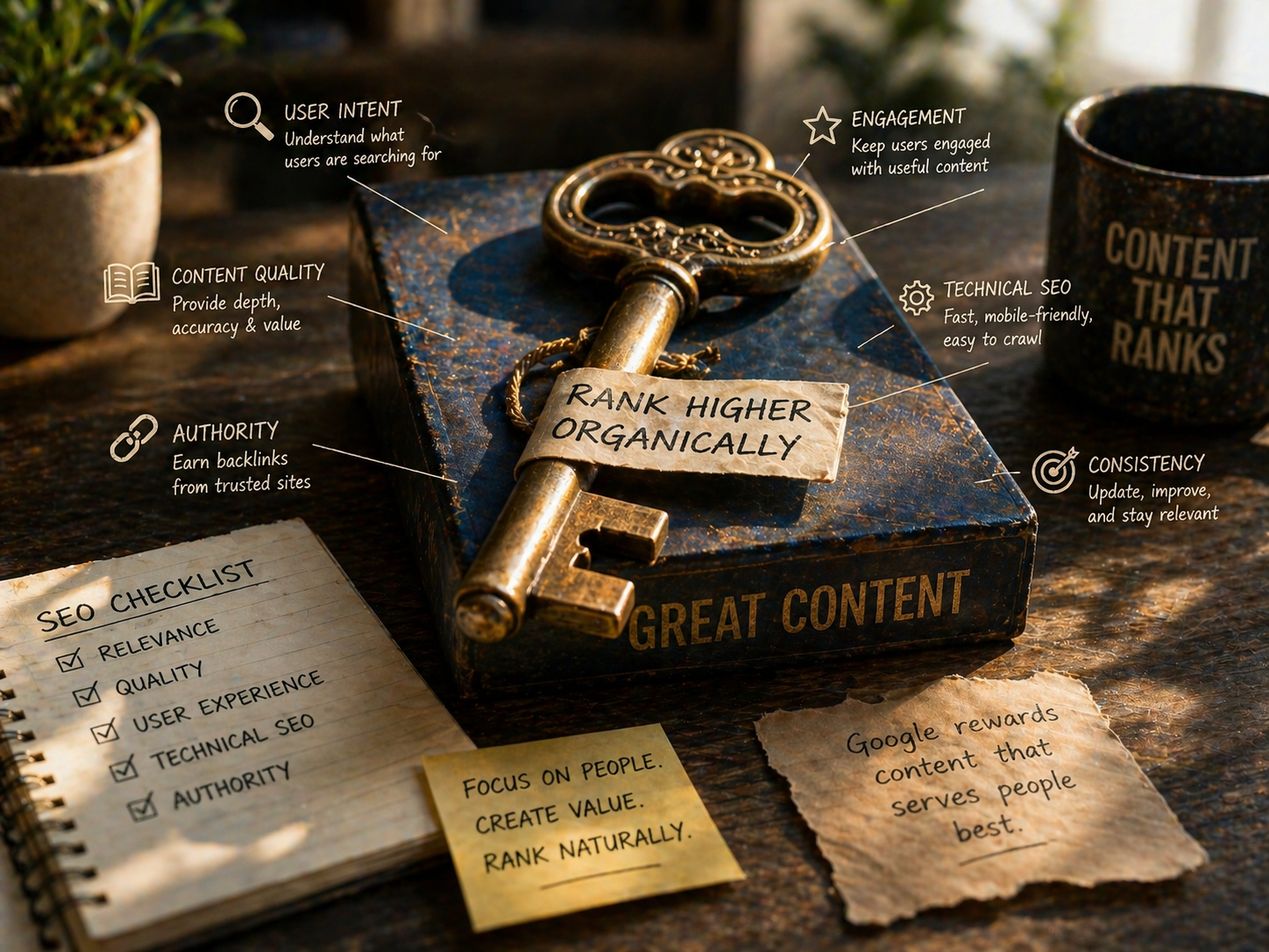 Key Phrases & Words Within the Content – Your keyword or keyphrase has to be spread around within the content of your webpage at a certain density so that Google can say, “Yes! this site is about what the title tag says it’s about!” Google absolutely loves and strives for relevance, and they’ll give you points for being relevant.